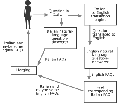 It is also possible to set up this process without having any translated answers. This will allow users to ask questions in their native language, but get the answer in English. Since many people handle English better as a passive than as an active language, this would be a useful tool for them.